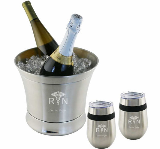 Cubo de hielo de acero inoxidable grabado con 2 copas de vino sin tallo