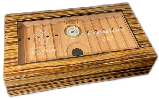 Cave à cigares en bois de Techwood africain gravé avec couvercle en verre ~ Obeche