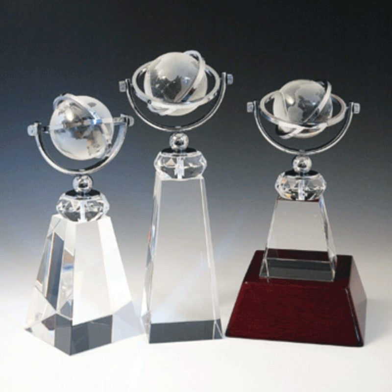 Offrez-leur le globe terrestre rotatif gravé en cristal. Ajoutez votre personnalisation ou le logo de votre entreprise sur la base.